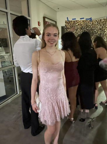 Ashley Griggs ‘28 (left) also found her dress at Windsor, but she bought it back in August to give herself plenty of time to plan ahead. Her favorite part of the dress is the style, from the sleek navy color to the sequins, giving it the final polished look. She says it perfectly matches her fashion look and made her feel confident the whole night.