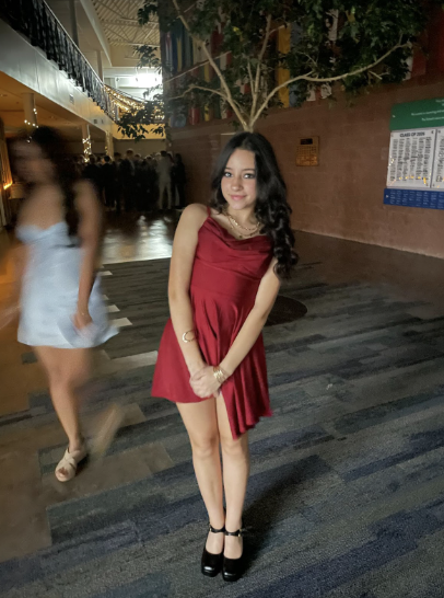 Isabella Prunes ‘29 received her dress from her grandmother, who bought it three weeks in advance from the Homecoming dress. It is difficult to spot in the photo, but her favorite detail of her dress was a lace design, which really made the maroon color stand out. In addition, the dark red color perfectly matched the theme of this year’s Homecoming theme, “Masquerade.”